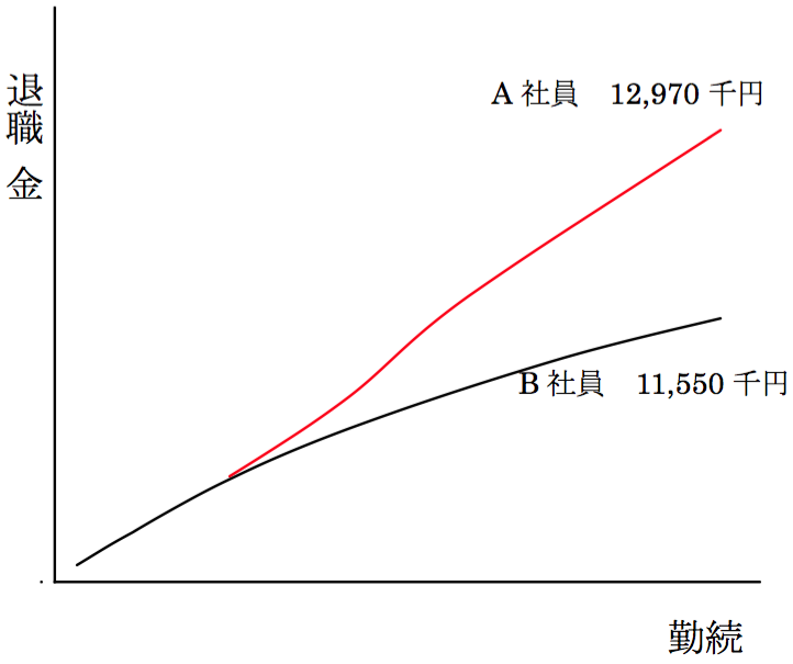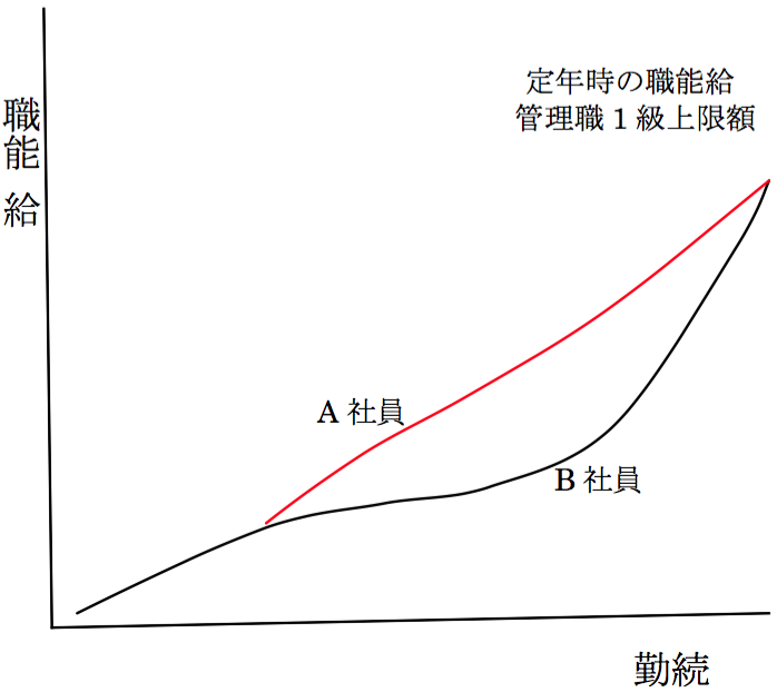 この結果、両者共に職能給は同額となり、また、これに乗ずる勤続年数別の支給率も同率と見込まれるので定年退職金も同額となり、結果的に途中の貢献度が適正に反映されないことになります。